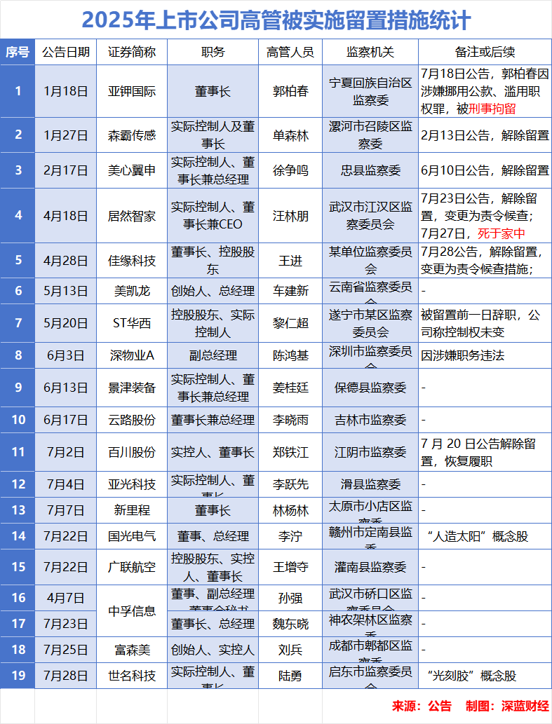 据深蓝财经根据上市公告不完全统计,今年以来,已有多达18家上市公司的19名高管被监察机关实施过留置措施。除深物业A副总经理陈鸿基、中孚信息副总经理孙强外,其余17人均为上市公司创始人、实控人、董事长这类“一把手”!其中包括大家耳熟能详的家居业三巨头:红星美凯龙创始人车建新、居然智家董事长汪林朋、富森美创始人刘兵。