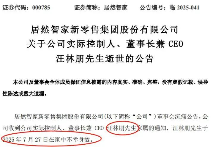 这两天最受关注的新闻,莫过于居然智家(000785.SZ)实际控制人、董事长兼CEO汪林朋去世的消息。