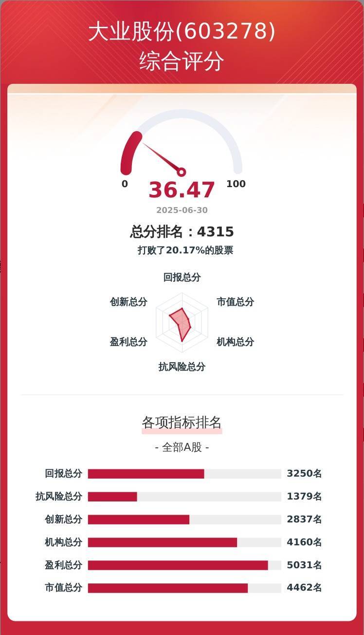 金融界上市公司研究院构建了一套上市公司韧性评价体系,从企业盈利、科技创新、股东回报、经营抗风险、市值表现及机构吸引力六个维度对企业进行量化评分,满分为100分。大业股份的韧性评价总分为36.47分,在A股5牛策略405家可比上市公司中排名第4315位。